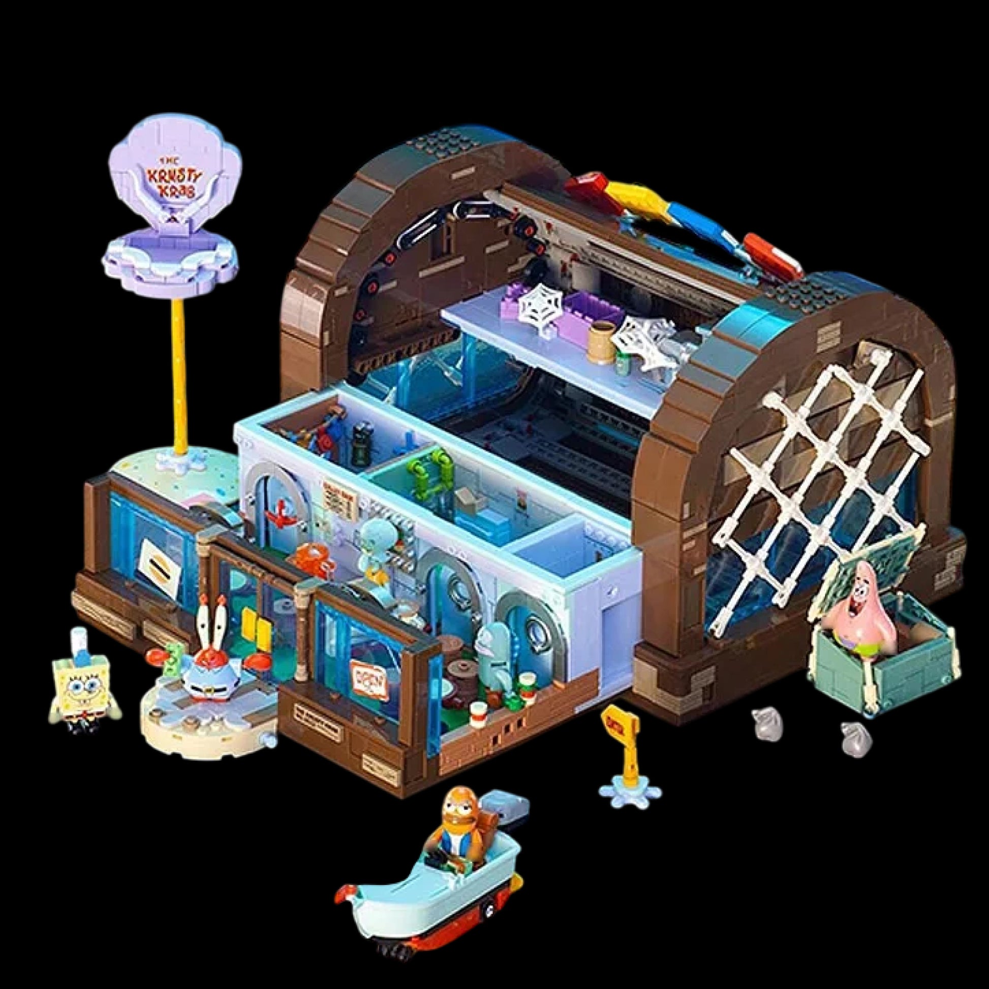Com 2.700 peças, este set recria em blocos o lendário restaurante Krusty Krab, cenário clássico de Bob Esponja e palco das aventuras mais divertidas da Fenda do Biquíni.