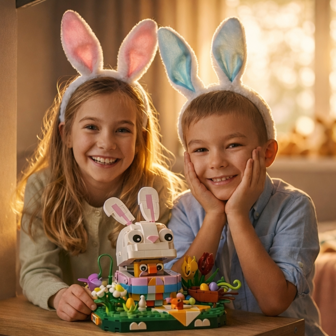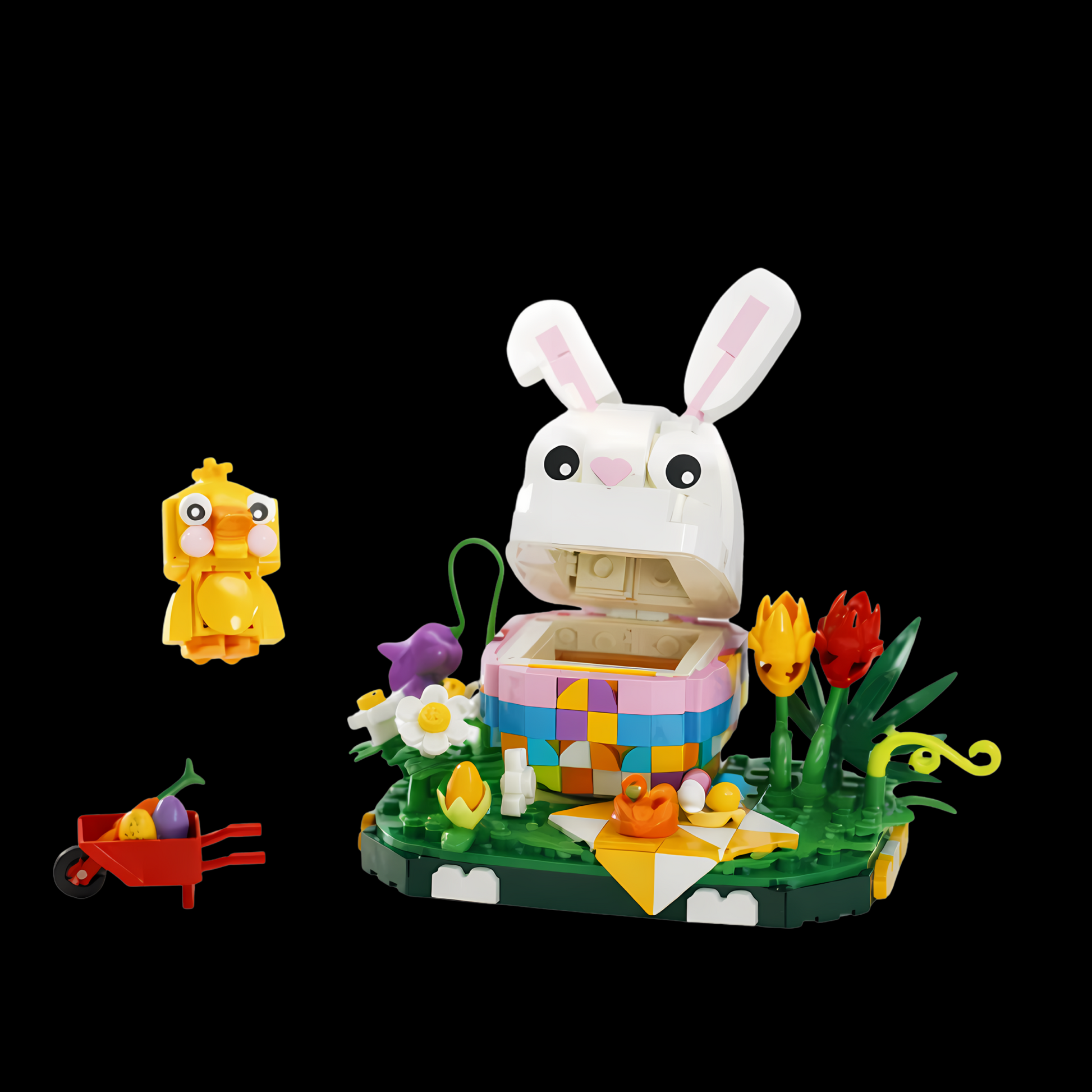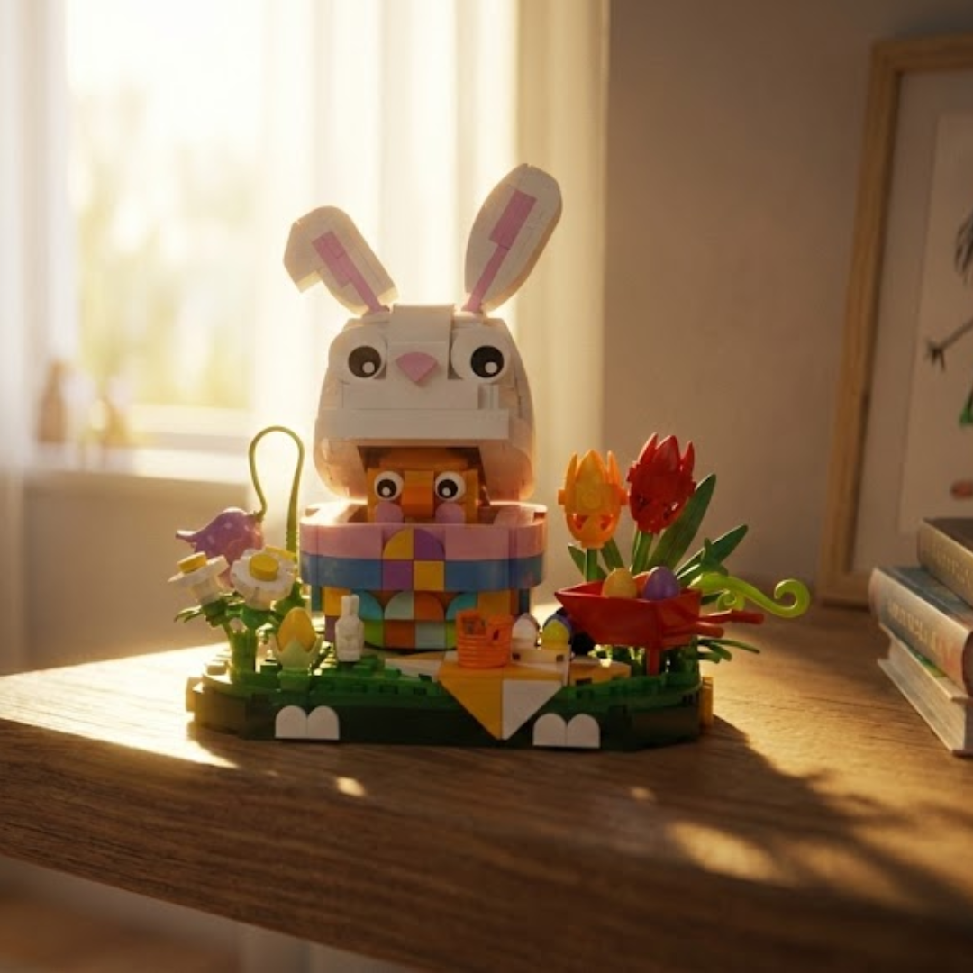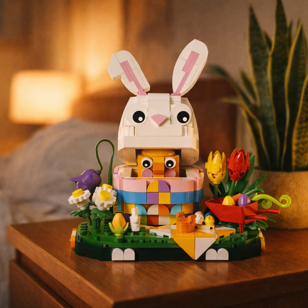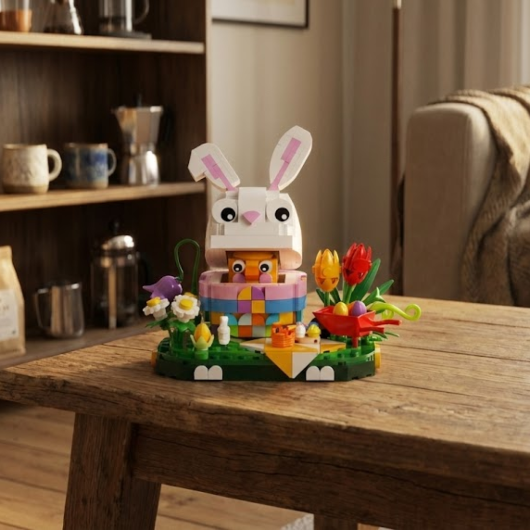 É uma celebração sensorial da estação mais florida do ano, onde cada uma das 400 peças em plástico ABS eco-friendly se transforma em pétalas vibrantes, cenouras alaranjadas e orelhas expressivas que capturam a essência lúdica deste símbolo pascal.