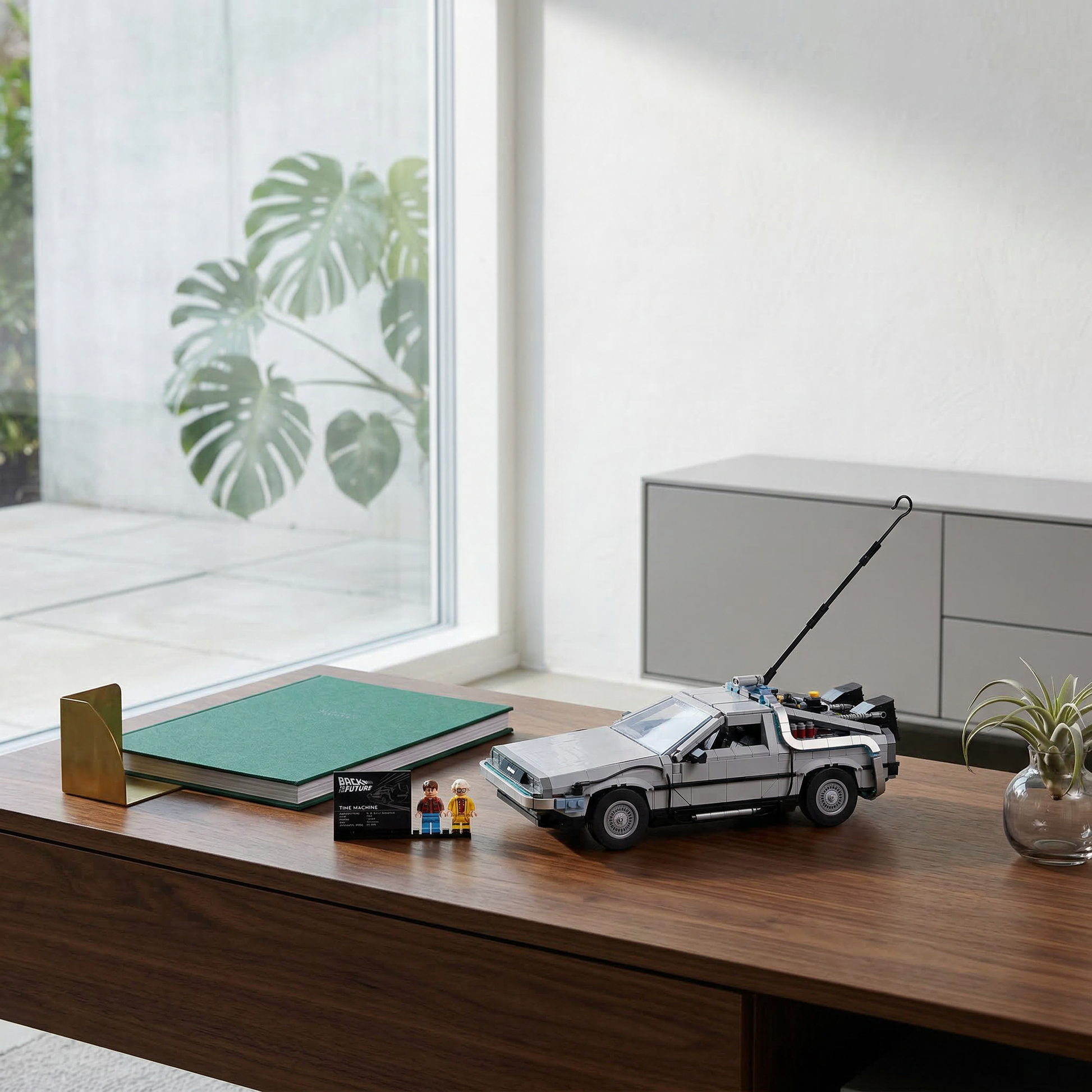Com 1872 peças meticulosamente encaixadas, este modelo reproduz cada detalhe icônico do carro: as portas asa de gaivota que se abrem lateralmente, o interior com o capacitor de fluxo, o painel de controle temporal e os acessórios que diferenciam cada versão do DeLorean nas três partes da trilogia.