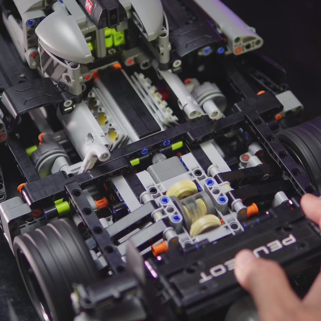 Essa miniatura do Hypercar Peugeot 9X8 com 1775 peças traz um motor V6 para ser montado com pecinhas e conectado com as rodas da miniatura.
