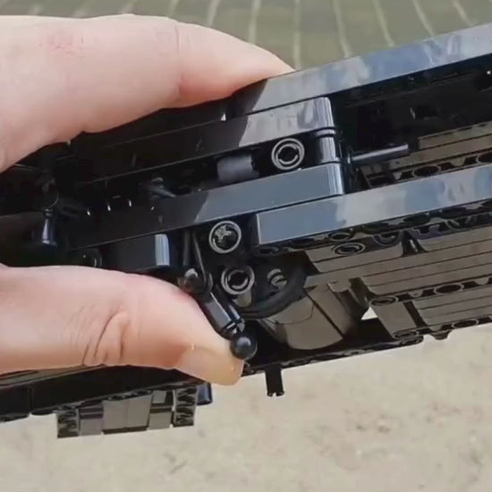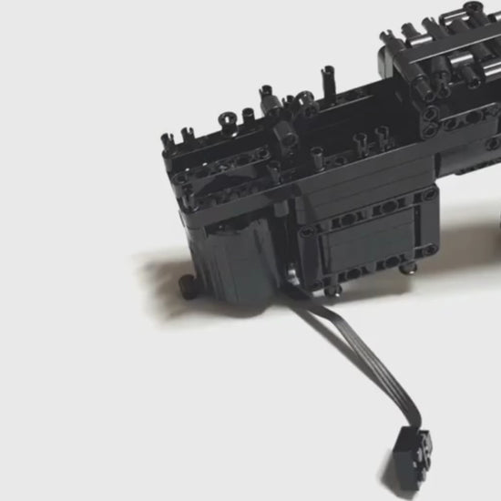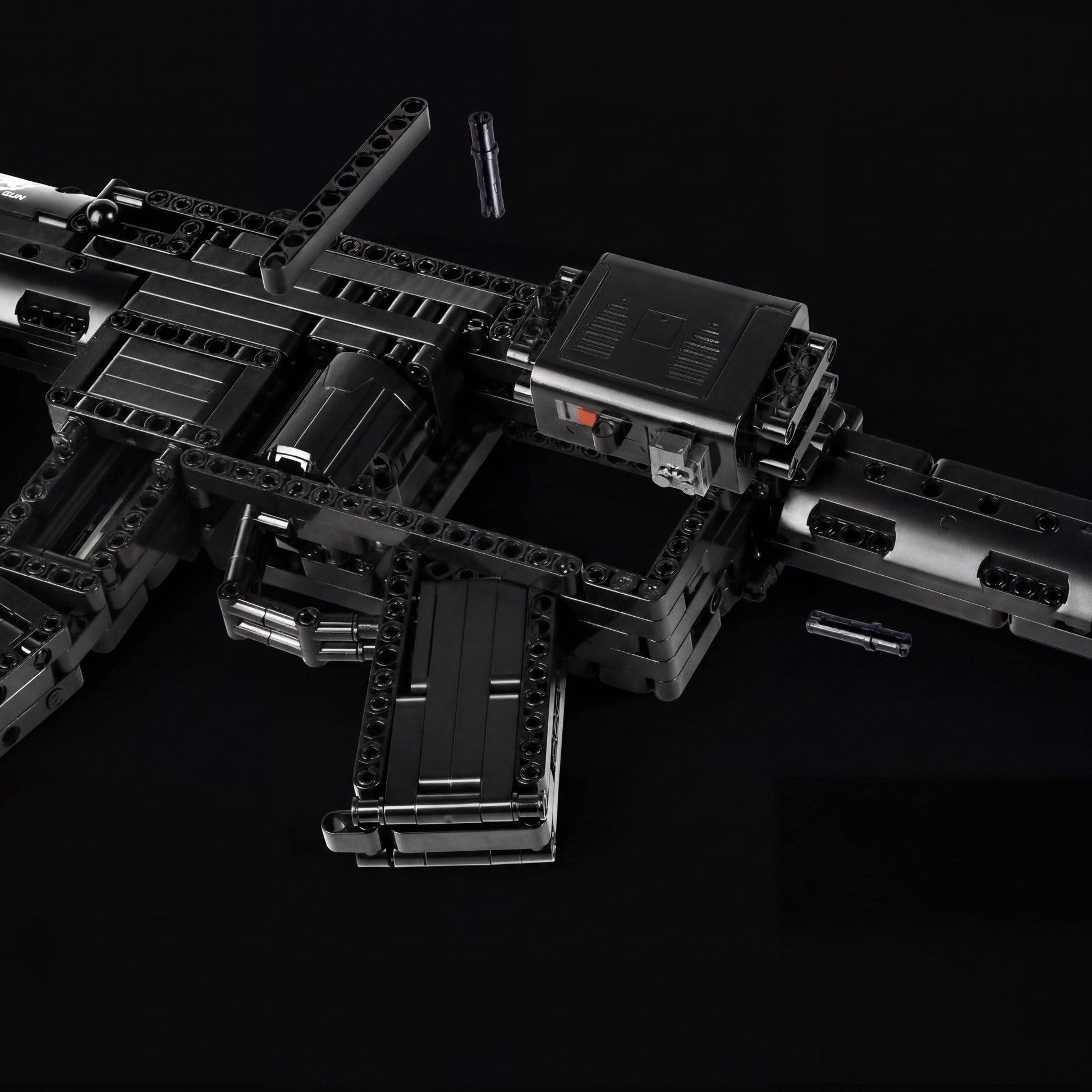Cada encaixe reproduz com rigor a silhueta compacta e agressiva de um rifle de assalto moderno, com um motor funcional integrado e mecanismo de disparo que eleva a experiência muito além da simples montagem.