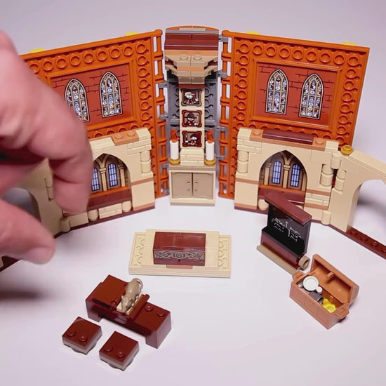 Tudo isso montado dentro de um livro mágico que se abre e revela a sala de aula completa, perfeita pra brincar, colecionar ou deixar em exposição com orgulho na sua coleção de Hogwarts! 🏰✨
