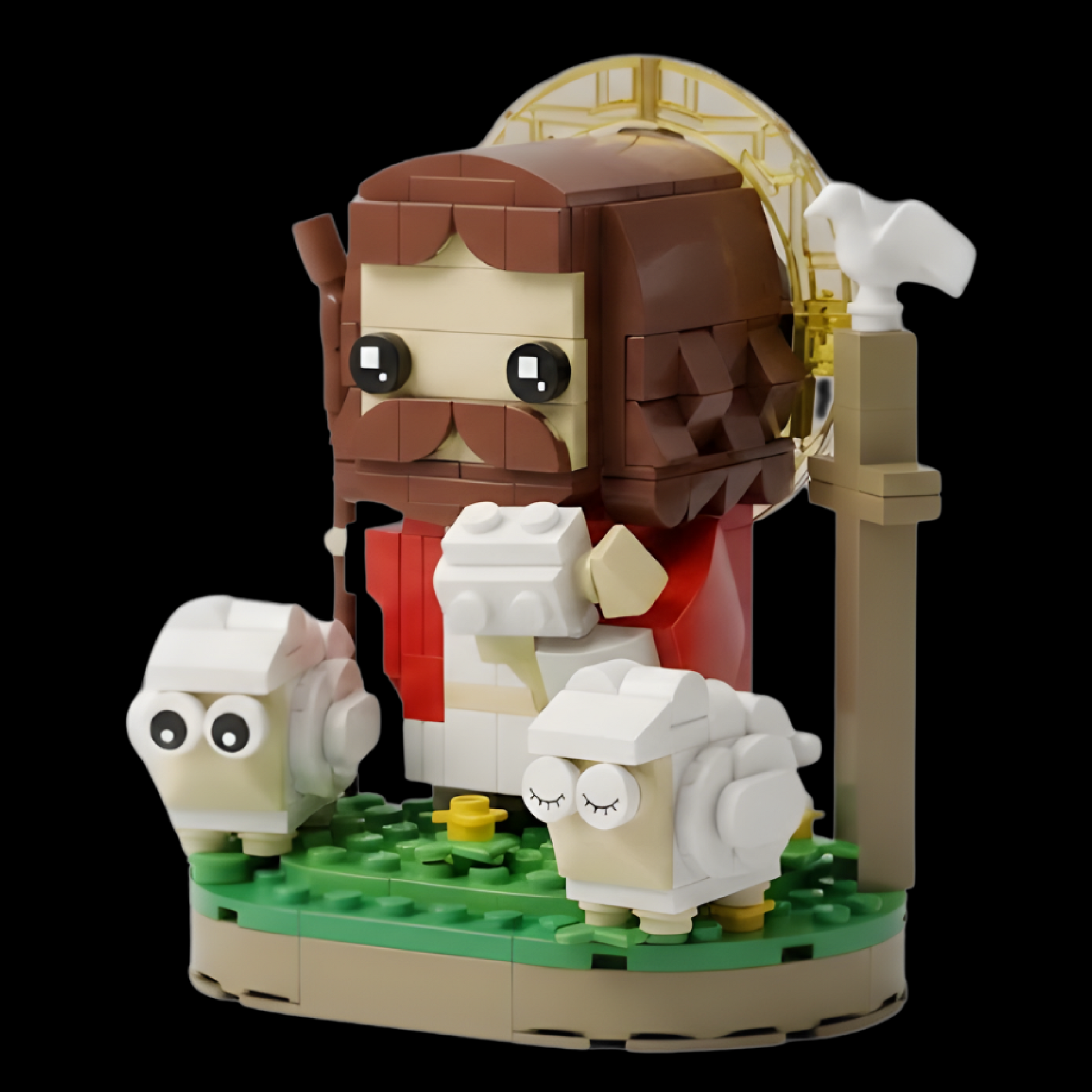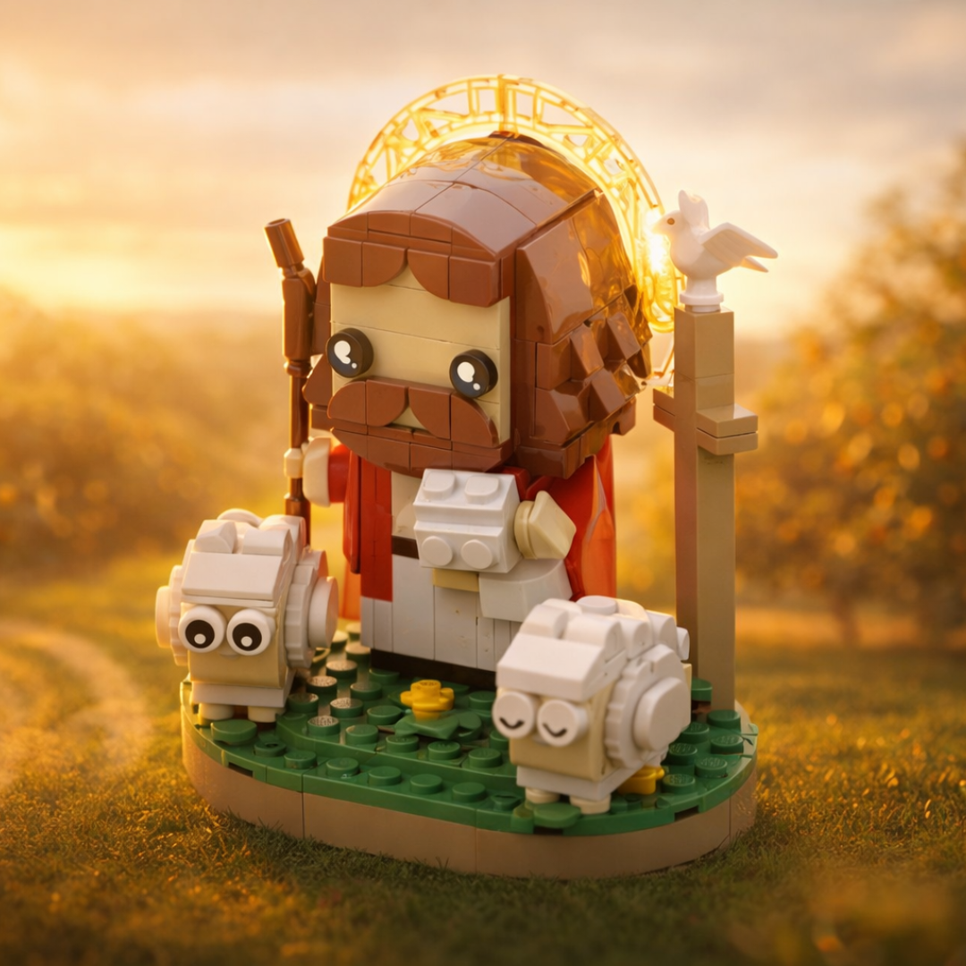 Esta escultura em blocos de montar de 277 peças não é apenas uma miniatura decorativa, mas uma representação material da compaixão divina, capturando o momento preciso em que o Pastor retorna com a ovelha resgatada em seus ombros.