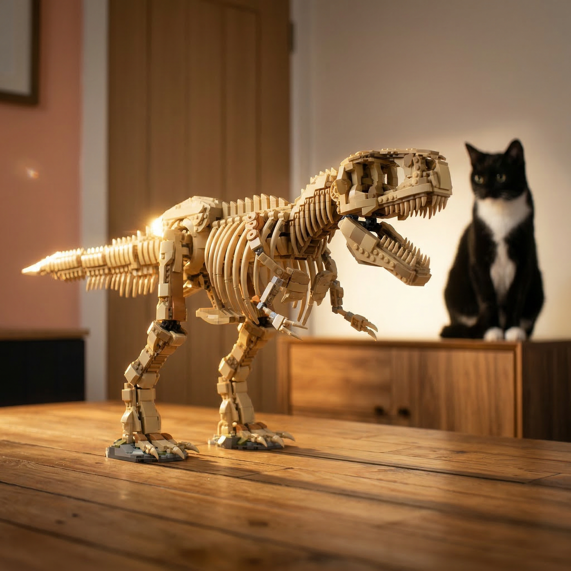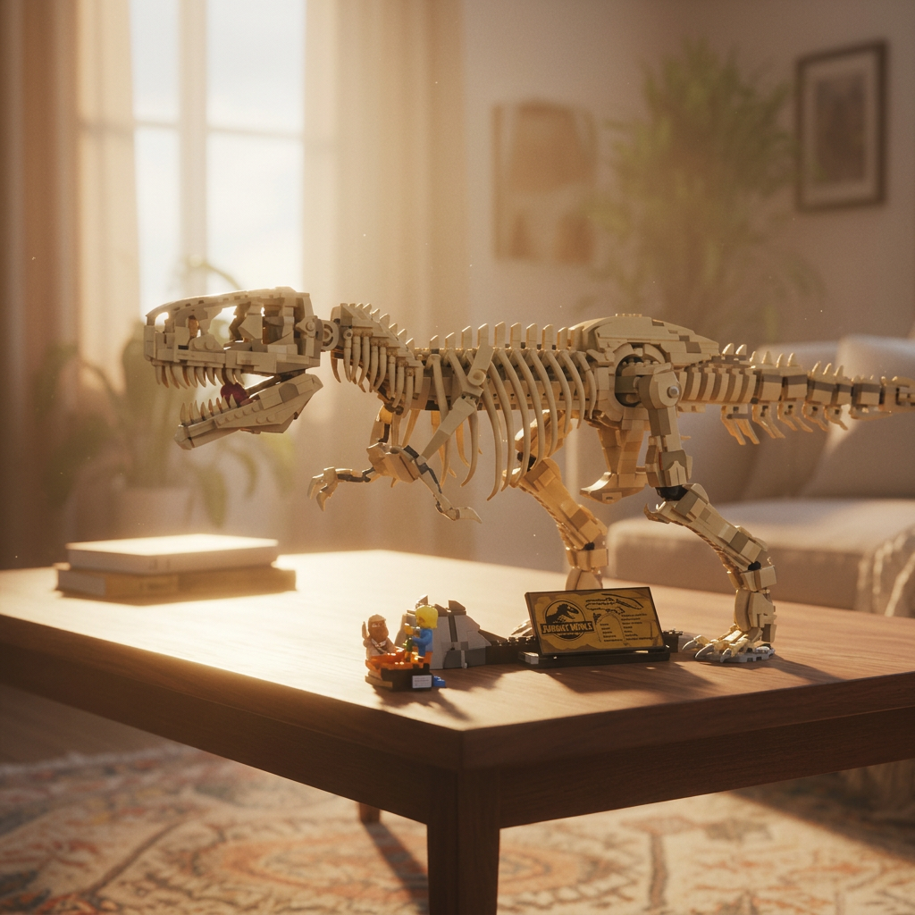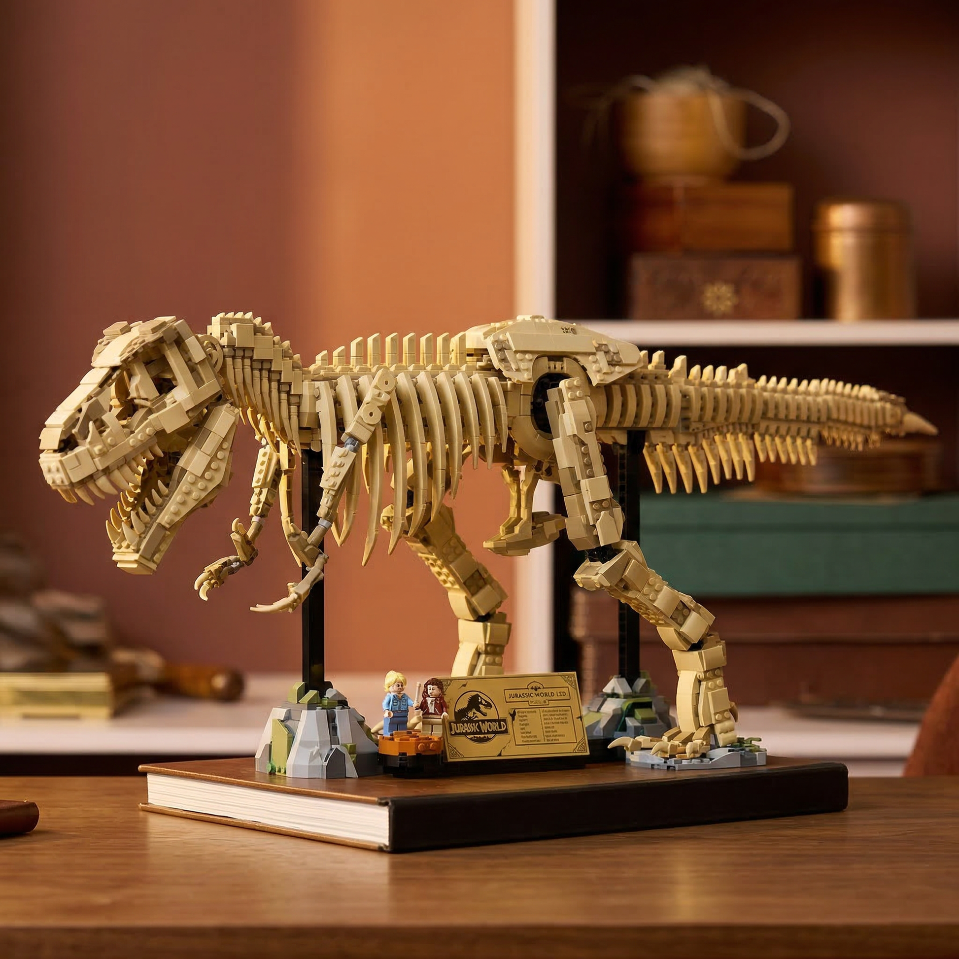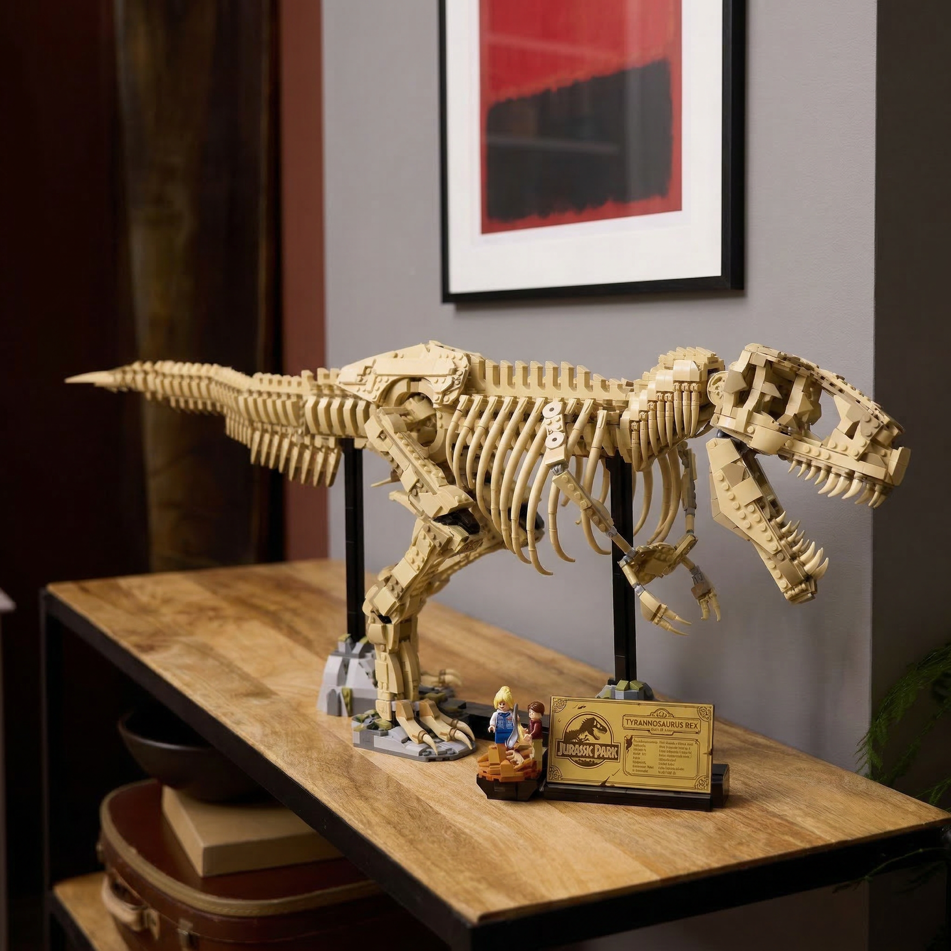 Ele não precisa de apresentação. Com 3.145 peças meticulosamente encaixadas, este fóssil em escala 1:12 recria o esqueleto do Tiranossauro Rex com uma fidelidade que rivaliza com as melhores exposições de paleontologia do mundo.