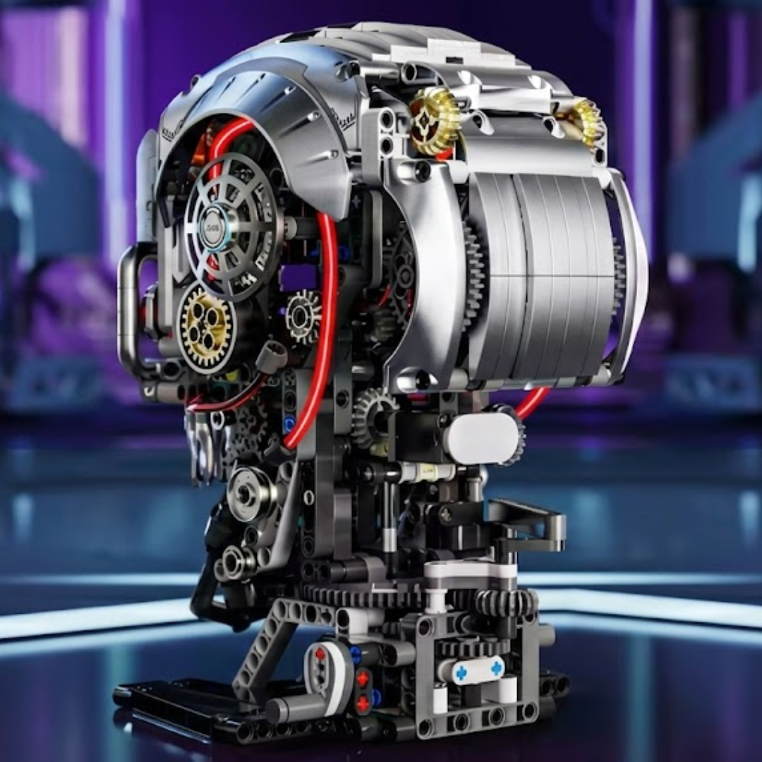 Este conjunto desafia você a construir uma escultura complexa, onde ossos são substituídos por engrenagens, pistões e conduítes.
