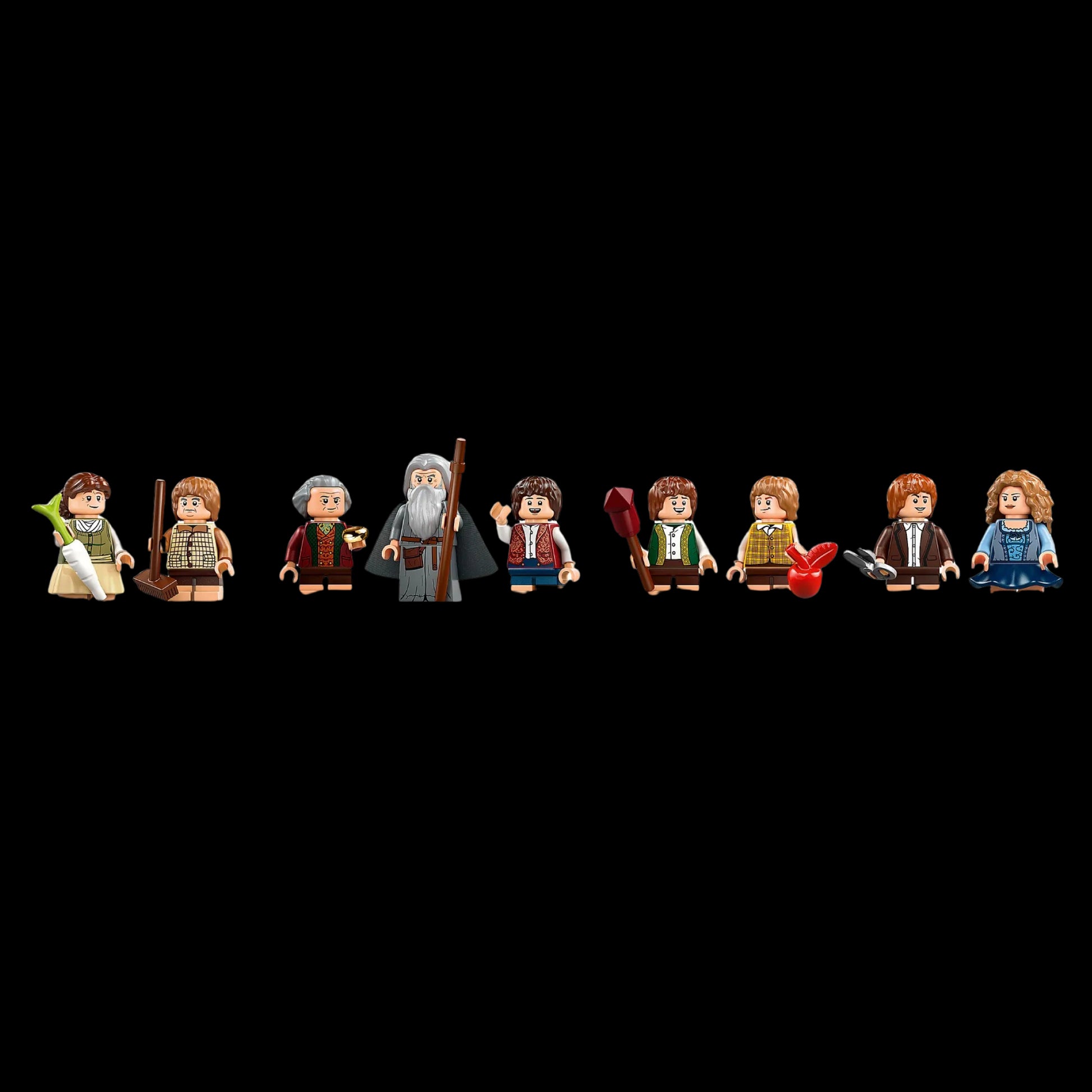 🎭 Inclui 9 minifiguras icônicas: Frodo, Sam, Bilbo Bolseiro, Gandalf, Merry, Pippin, Rosie, Lobélia e um Hobbit do Condado