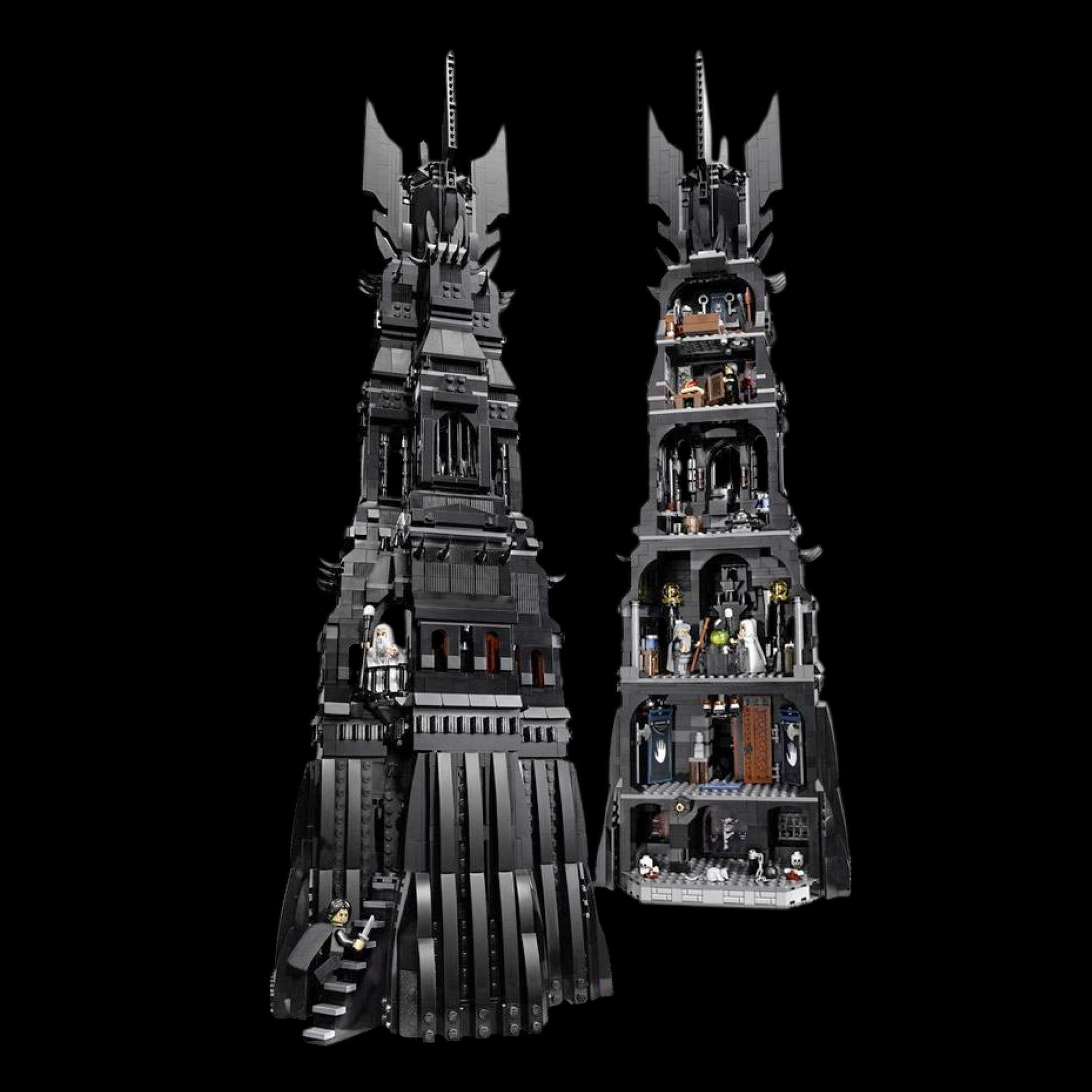 Com 2.359 peças e aproximadamente 73 cm de altura, a Torre de Orthanc recria o reduto de Saruman em múltiplos andares com ambientes icônicos — biblioteca, sala de alquimia, trono, masmorra — além do enigmático palantír com iluminação.