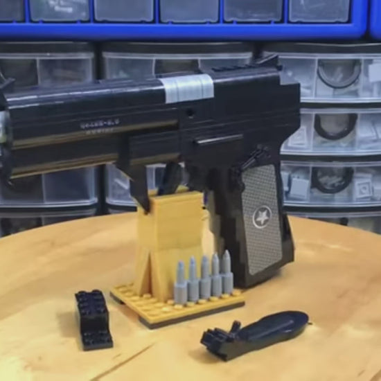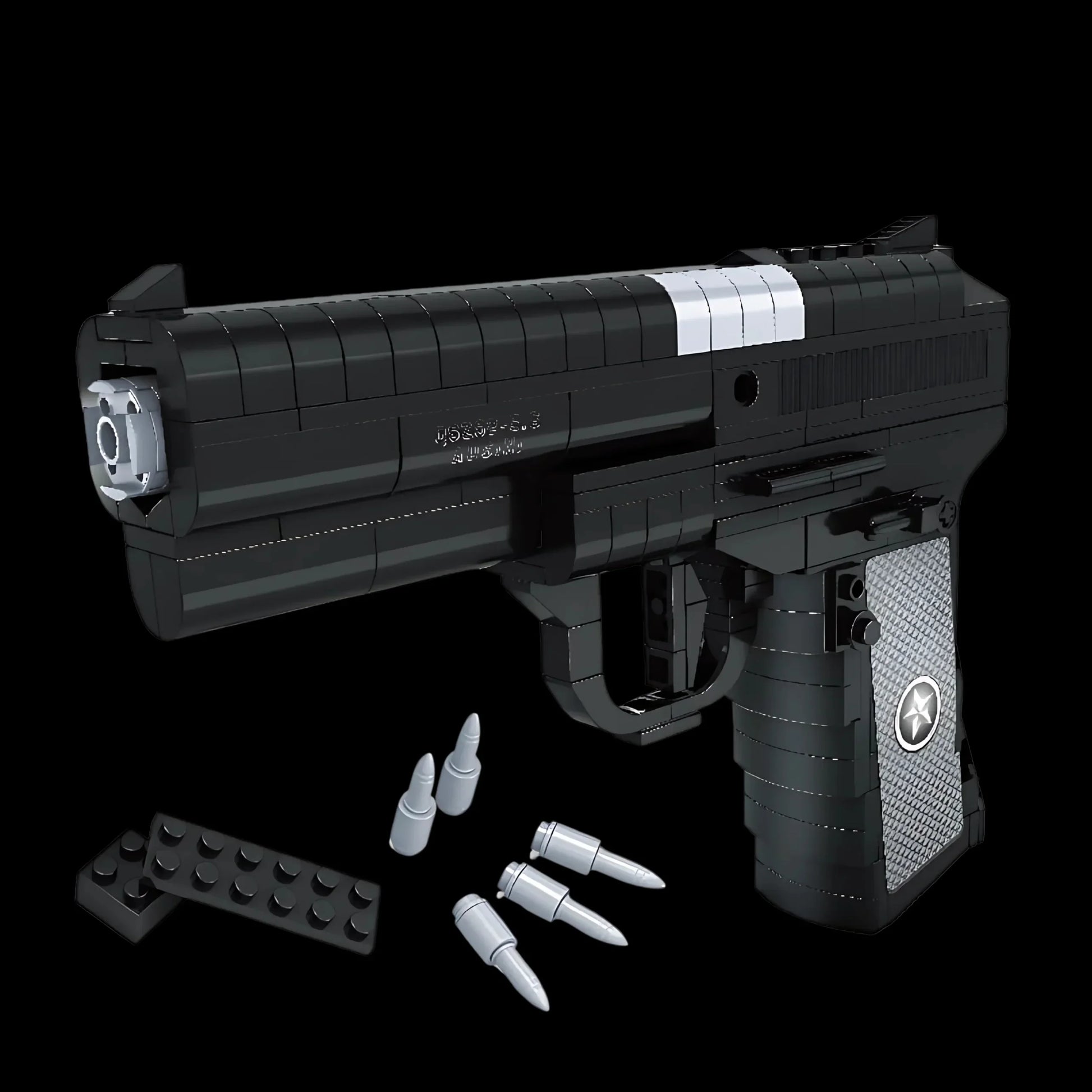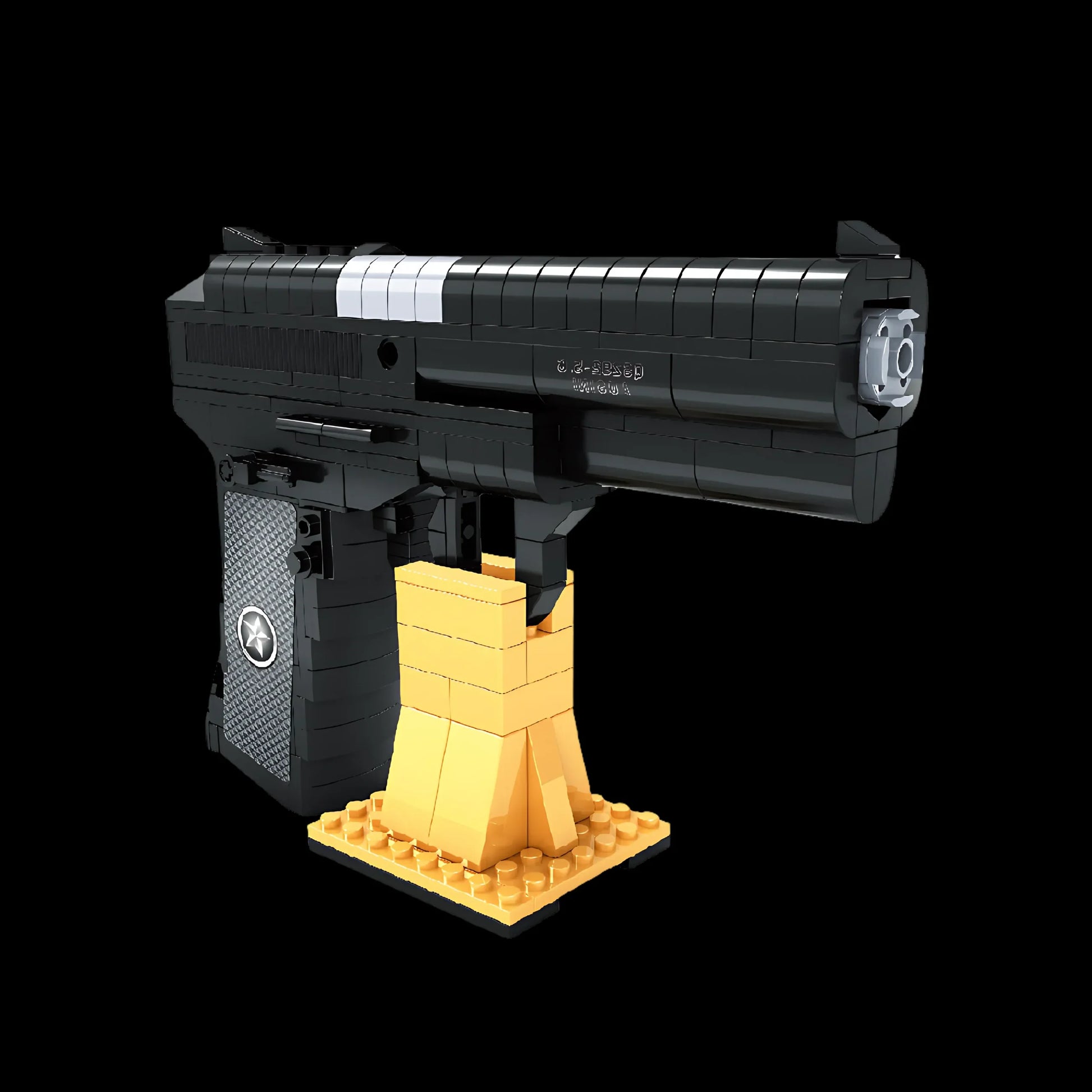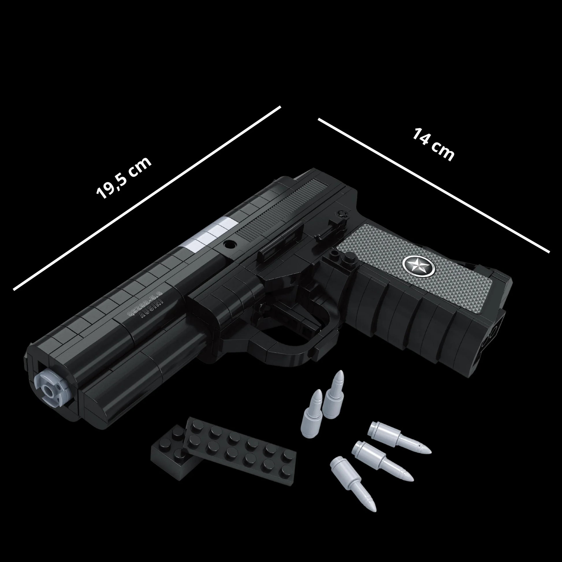 Agora, essa história se traduz em 327 peças de encaixe perfeito que reconstituem cada detalhe da pistola com fidelidade em escala 1:1.