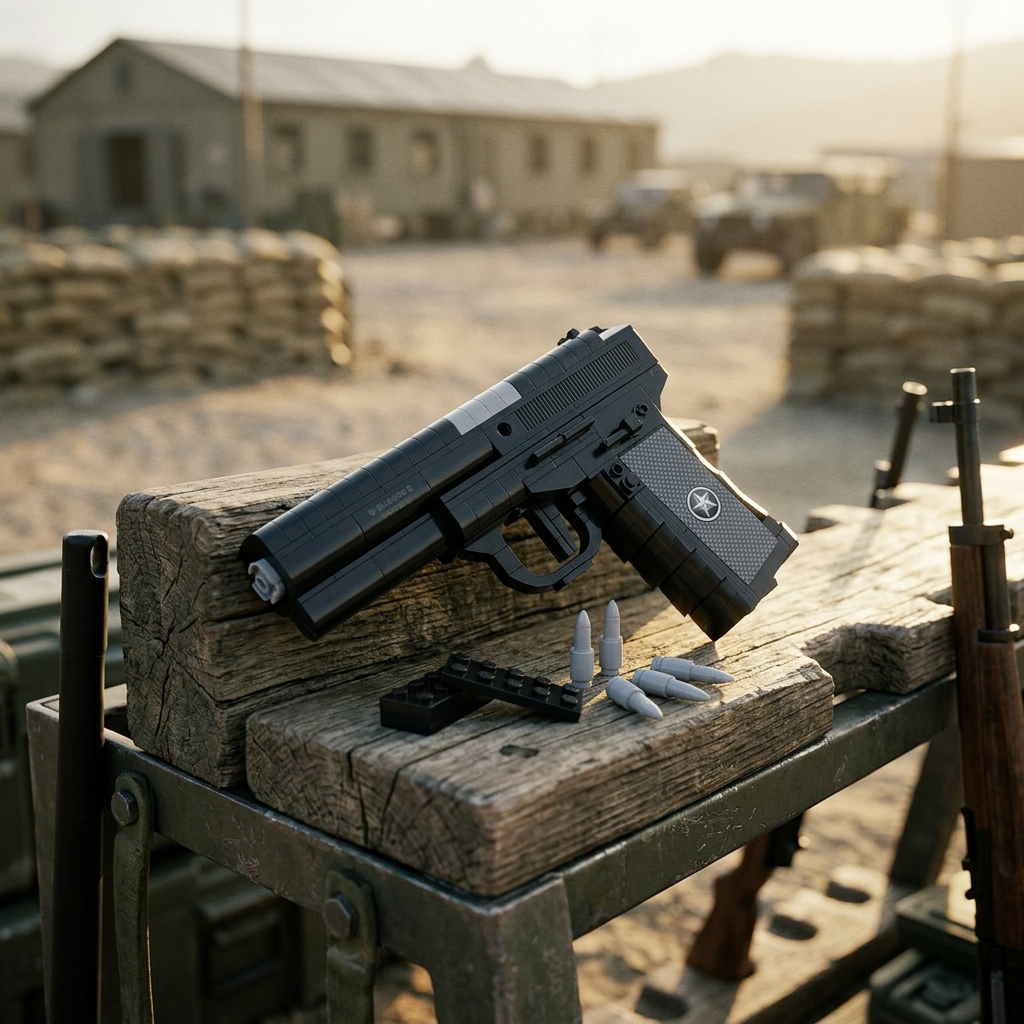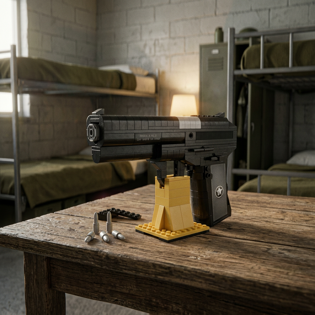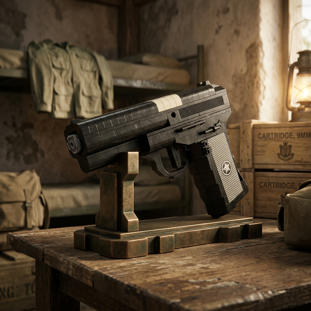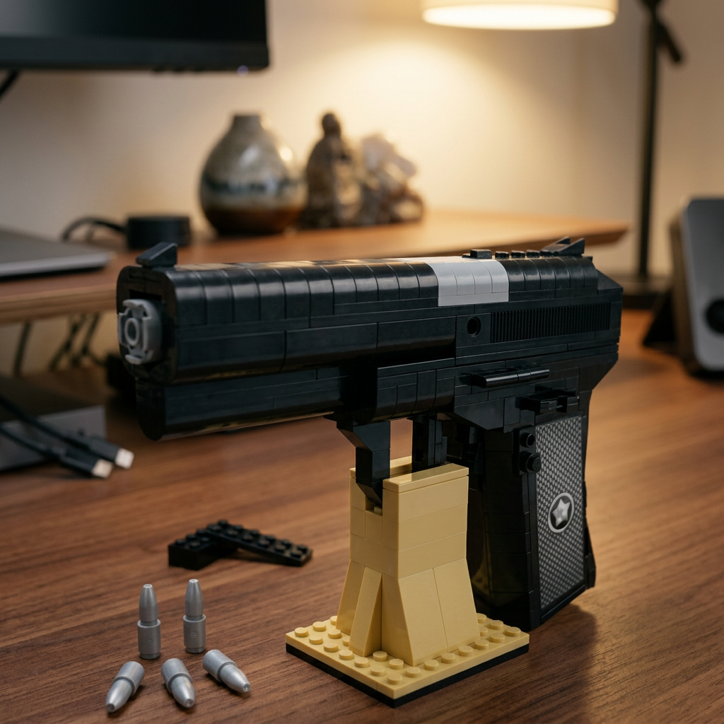 Agora, essa história se traduz em 327 peças de encaixe perfeito que reconstituem cada detalhe da pistola com fidelidade em escala 1:1.