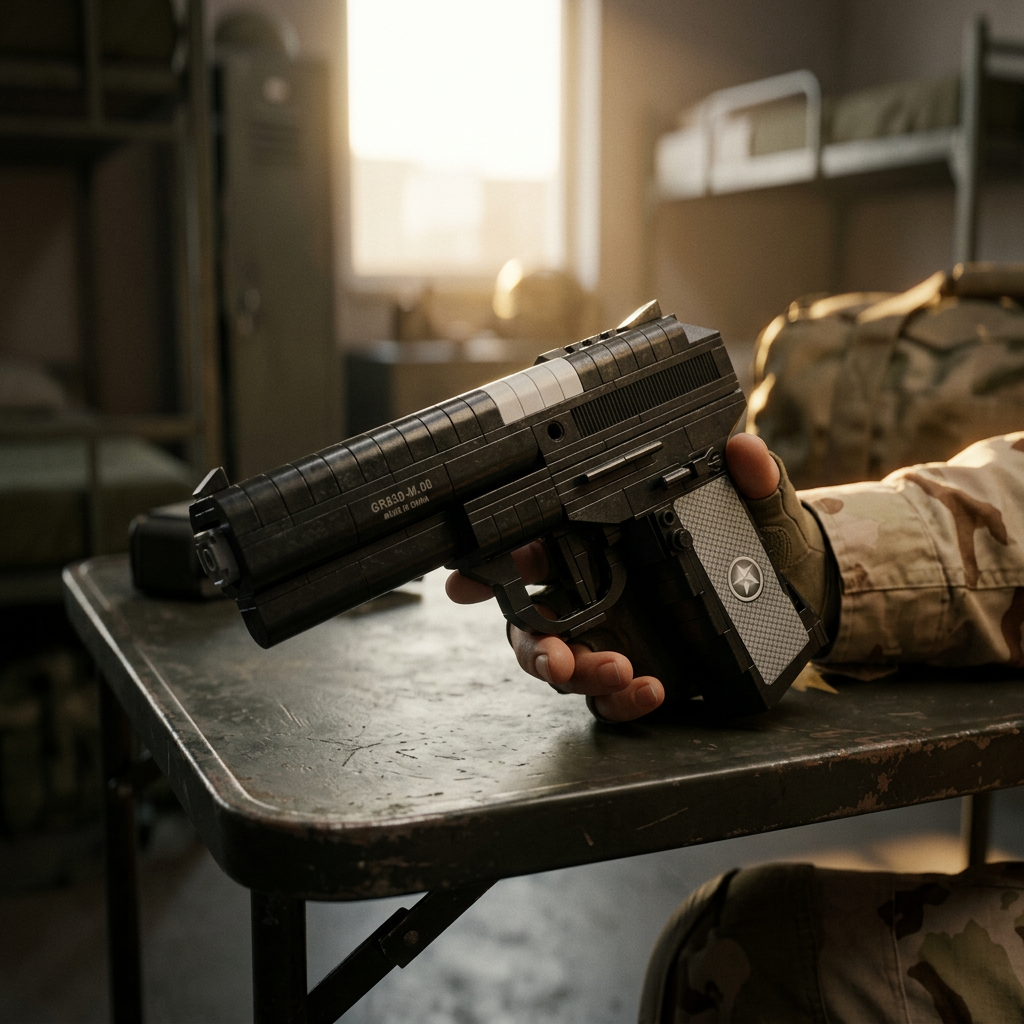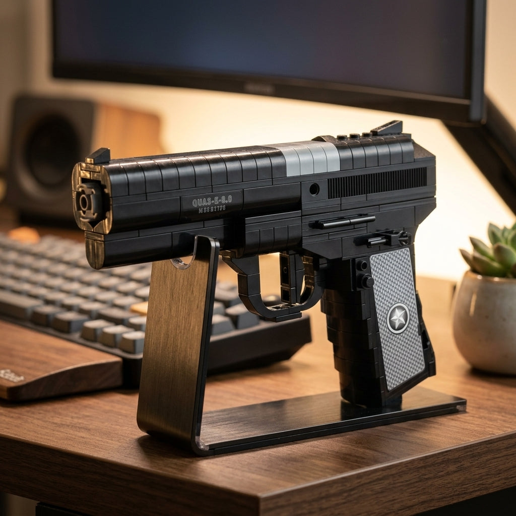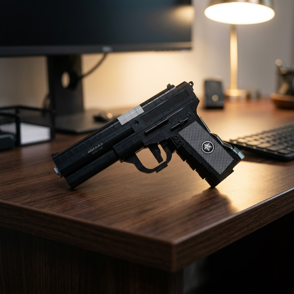 O resultado é uma réplica que respeita o cânone do objeto real: a geometria angulosa do slide, o perfil compacto da coronha, a guarda do gatilho e a textura característica do cabo.
